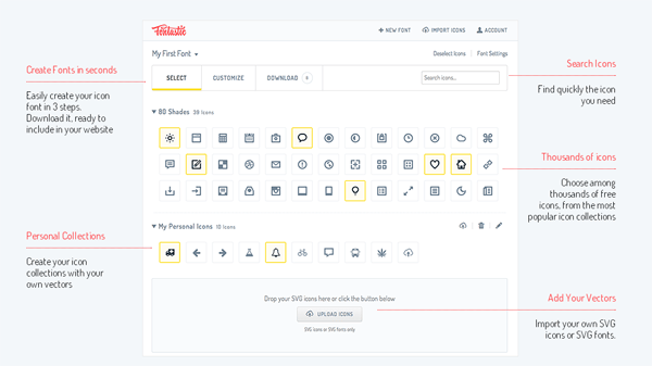IconVault is lightweight. You can use this fast and easy with just very short loading time. Basically, you need to upload a folder of your collected icons then make your own icon fonts. Its drag and drop function makes it even easier to use.