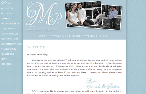 This is a good example of a “flashy” wedding website. It’s filled with photos of the bride and groom, as well as their personal information.