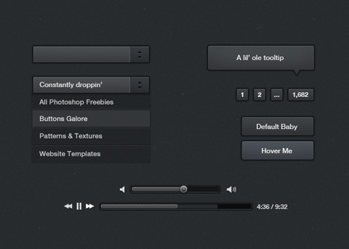 This UI kit has drop-down menus and even a music player, in black-gray color scheme. The buttons and some other elements are smooth and in a rounded rectangle shape.