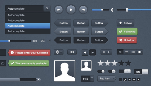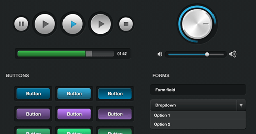 This is a smooth PSD UI kit that has a touch of aqua blue. It’s complete with radio buttons, players and other elements.