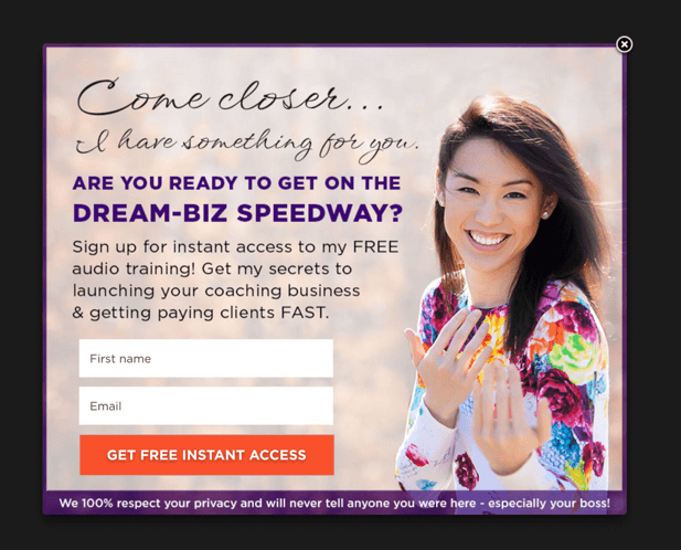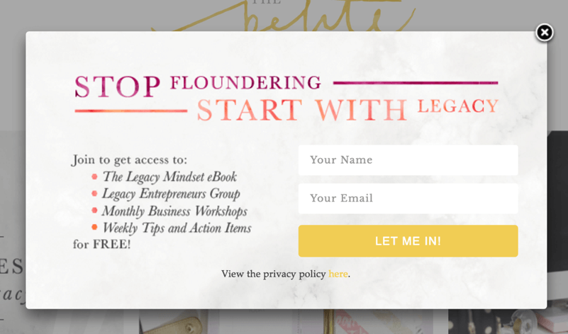 For example, maybe you’re a travel blogger and your most visited page is your “About Me”. You could create a short e-book telling your readers exactly how you came to be a professional travel blogger alongside your ultimate travel bucket list. Or if you’re a website aimed at female entrepreneurs and your most popular post is all about networking, your popup could offer an invite to a private Facebook group for visitors to meet and mingle online.