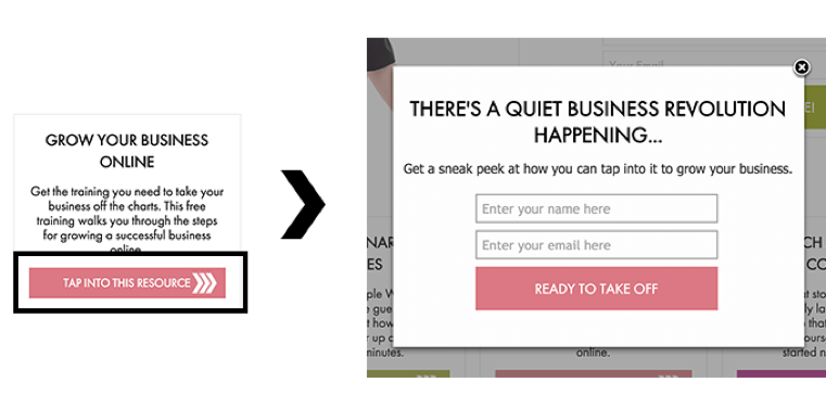 - Click-based popup (usually for content upgrades): Again, if you want your incentive to relate to something already on your site, it can be configured to appear once your reader has clicked on that piece of content or a relevant link. Here’s an example, when you click that “TAP INTO THE RESOURCE” button, a popup form will show up.