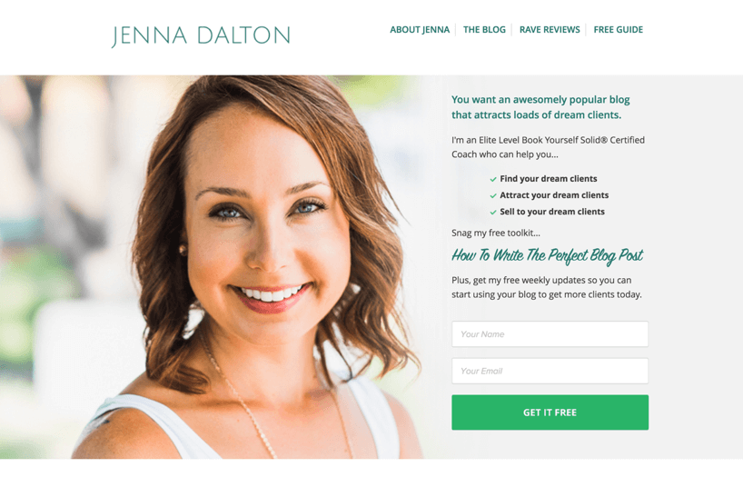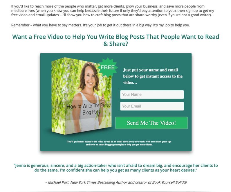 - Embed the popup anywhere on your site: the homepage (above the fold), top banner, bottom banner at the end of a blog post, in a sign-up page of its own… slot it in as much as you can and REALLY grab their attention. Check out all the places Jenna Dalton places her opt-in.