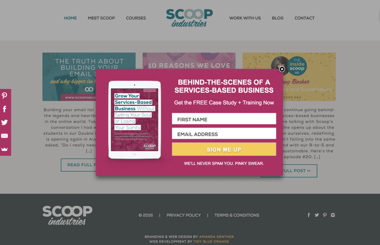 Here’s a bad-ass example from Scoop Industries which not only calls to the needs and interests of her readers but lays out what they will gain from signing up.
