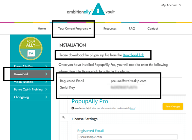 - Download the PopupAlly Pro plugin: login to Ambitionally > My Current Programs > PopupAlly Pro > Download > Click “Download Link”. In that same page, you’ll see your registered email and your serial key.